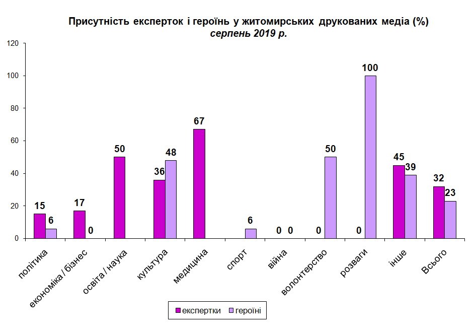 Присутність експертної думки жінок в друкованих ЗМІ Житомирщини залишається незмінною (в порівнянні з червневим моніторингом) – 32%. Загальний відсоток героїнь публікацій дещо менший – 23 (в червні – 29%). Тематичний аналіз показав, що найбільше експертної думки жінок в публікаціях на медичну тему – 67% та матеріалах, що стосуються проблем освіти – 50%. Це можна вважати тенденцією, оскільки й результати минулих моніторингів показують перевагу жінок у цих темах.