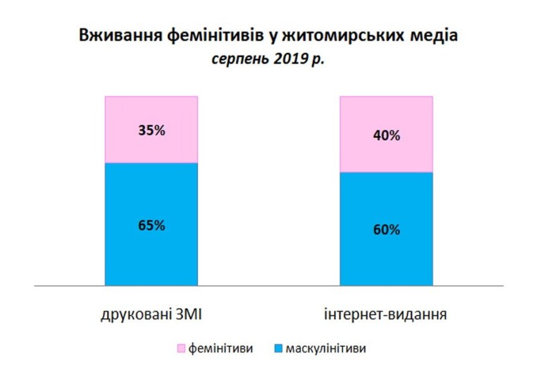 У новинах інтернет-видань Житомирщини фемінітиви вживаються більше, ніж у друкованих ЗМІ – в 40%. Найбільший відсоток фемінітивів припадає на новини сайту 1zt.ua (67%), на другомі місці – Житомир.інфо (48%), найменше – в Журналі Житомира (13%). Частіше почали з’являтися такі фемінітиви як продавчиня, адвокатка, членкиня (Житомир.інфо). Однак нерідко, там, де потрібно і можна вживати фемінітиви, ще вживають мускулінітиви: «Організатором і натхненником фестивалю є його дочка, відома співачка Ірина Шинкарук» чи «відомий італійський скульптор, українка за походженням Олена Карамушка» (Житомир.інфо).
